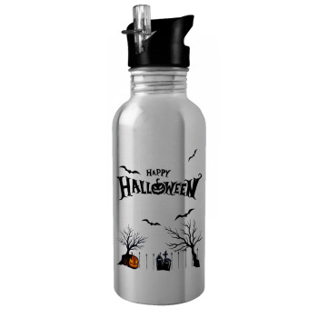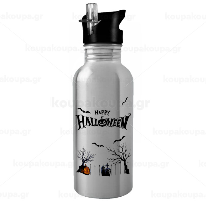 Happy Halloween cemetery, Παγούρι νερού Ασημένιο με καλαμάκι, ανοξείδωτο ατσάλι 600ml