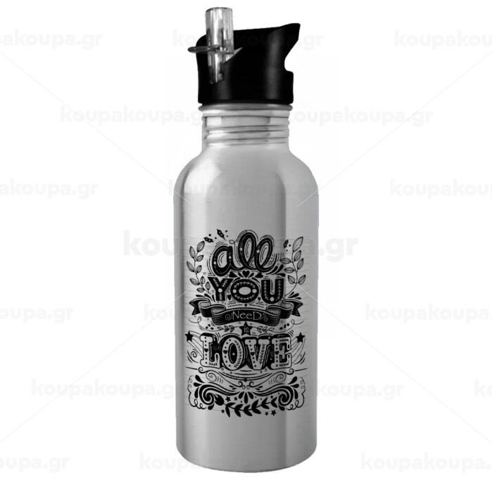 All you need is love, Παγούρι νερού Ασημένιο με καλαμάκι, ανοξείδωτο ατσάλι 600ml