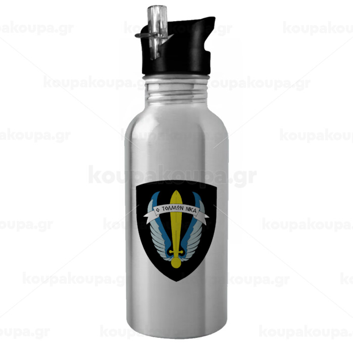 Έμβλημα Μονάδων Καταδρομών Ο Τολμων Νικα - Λοκ, Παγούρι νερού Ασημένιο με καλαμάκι, ανοξείδωτο ατσάλι 600ml