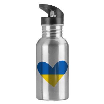 UKRAINE heart, Παγούρι νερού Ασημένιο με καλαμάκι, ανοξείδωτο ατσάλι 600ml