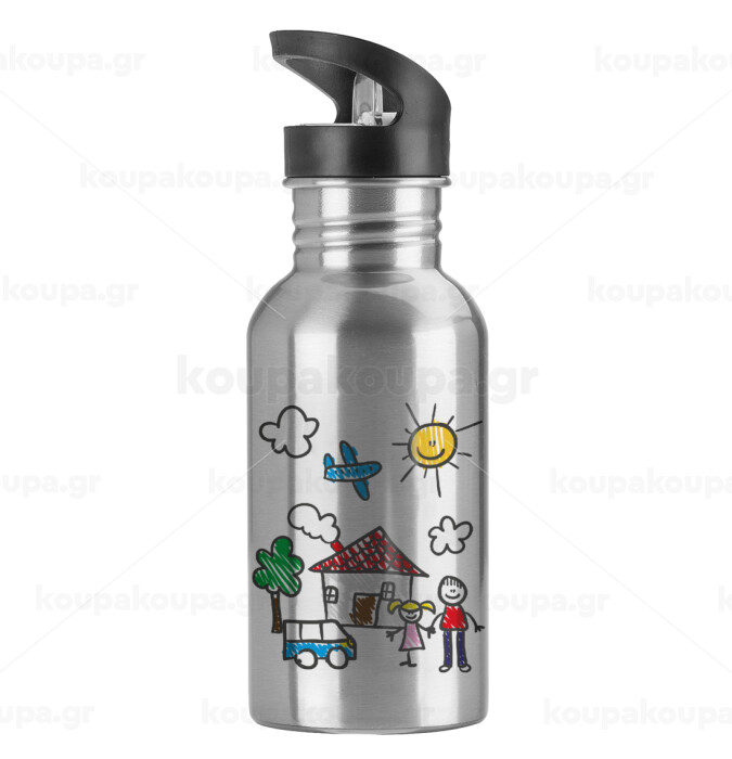 Παιδική ζωγραφιά, Παγούρι νερού Ασημένιο με καλαμάκι, ανοξείδωτο ατσάλι 600ml