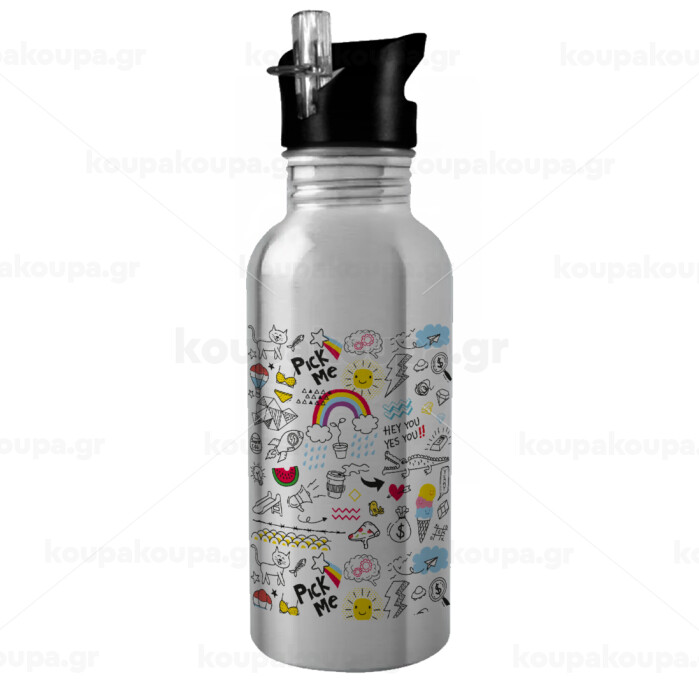 Doodle kids, Παγούρι νερού Ασημένιο με καλαμάκι, ανοξείδωτο ατσάλι 600ml