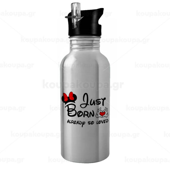 Just born already so loved, Παγούρι νερού Ασημένιο με καλαμάκι, ανοξείδωτο ατσάλι 600ml