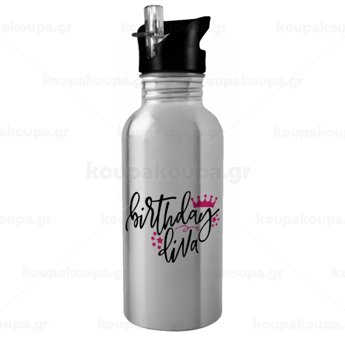Birthday Diva queen, Παγούρι νερού Ασημένιο με καλαμάκι, ανοξείδωτο ατσάλι 600ml