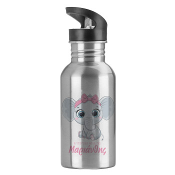 Η νονά μου, ελεφαντάκι ροζ, Παγούρι νερού Ασημένιο με καλαμάκι, ανοξείδωτο ατσάλι 600ml