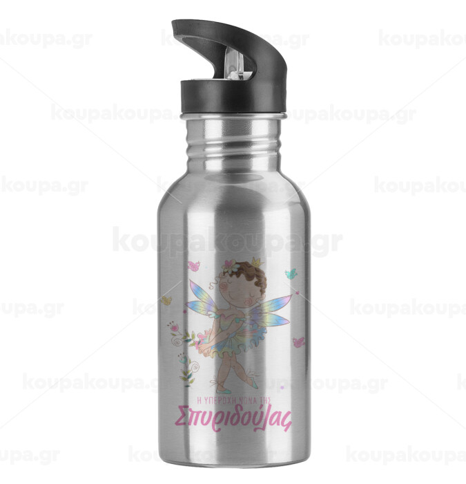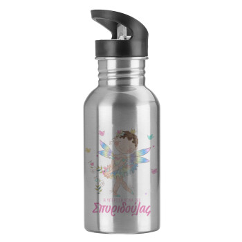Η νονά μου, Νεράϊδα, Παγούρι νερού Ασημένιο με καλαμάκι, ανοξείδωτο ατσάλι 600ml