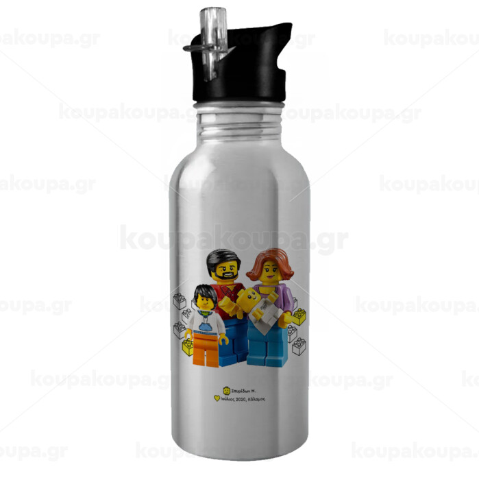 Τύπου Lego family, Παγούρι νερού Ασημένιο με καλαμάκι, ανοξείδωτο ατσάλι 600ml