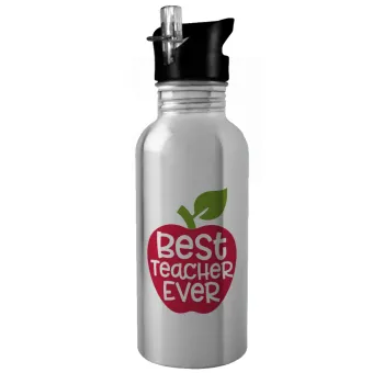 best teacher ever, apple!, Παγούρι νερού Ασημένιο με καλαμάκι, ανοξείδωτο ατσάλι 600ml