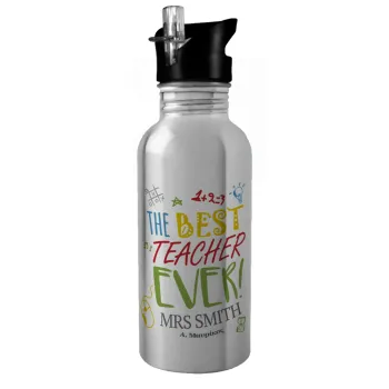 The best teacher ever!, Παγούρι νερού Ασημένιο με καλαμάκι, ανοξείδωτο ατσάλι 600ml