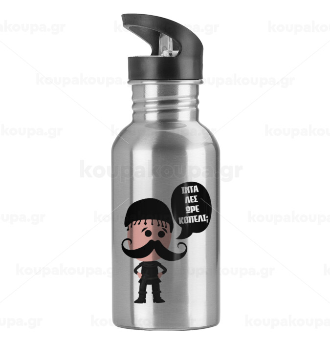 Κρητικός "Ίντα λες ωρέ κοπέλι", Παγούρι νερού Ασημένιο με καλαμάκι, ανοξείδωτο ατσάλι 600ml
