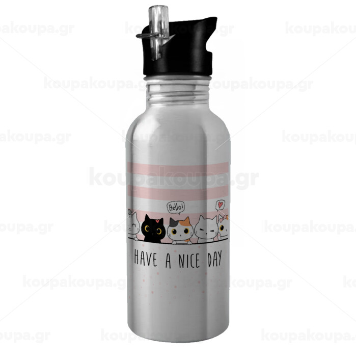 Have a nice day cats, Παγούρι νερού Ασημένιο με καλαμάκι, ανοξείδωτο ατσάλι 600ml