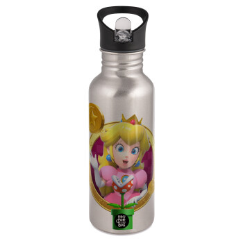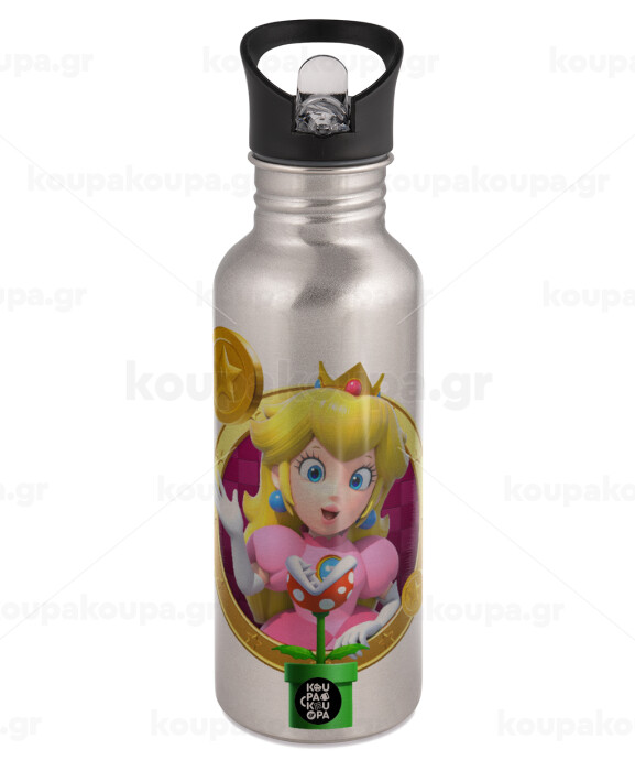 Princess Peach Toadstool, Παγούρι νερού Ασημένιο με καλαμάκι, ανοξείδωτο ατσάλι 600ml