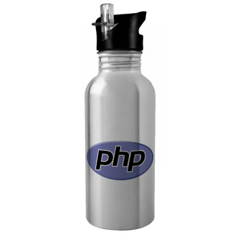 PHP, Παγούρι νερού Ασημένιο με καλαμάκι, ανοξείδωτο ατσάλι 600ml