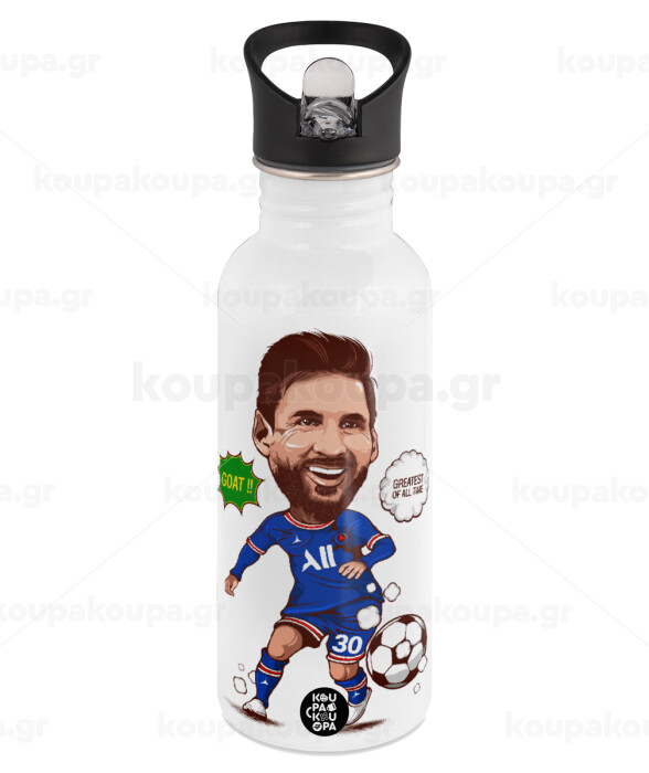 Lionel Messi drawing, Παγούρι νερού Λευκό με καλαμάκι, ανοξείδωτο ατσάλι 600ml