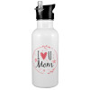 I Love you Mom pink, Παγούρι νερού Λευκό με καλαμάκι, ανοξείδωτο ατσάλι 600ml