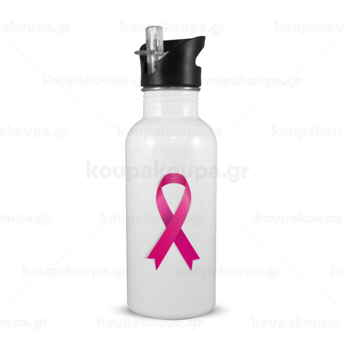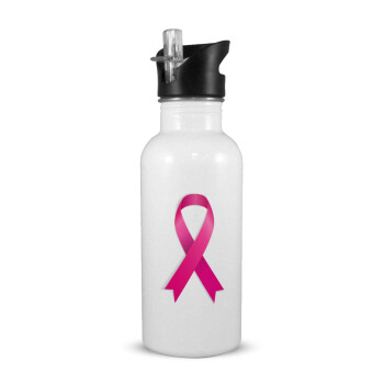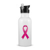 Παγκόσμια Ημέρα κατά του Καρκίνου, Παγούρι νερού Λευκό με καλαμάκι, ανοξείδωτο ατσάλι 600ml