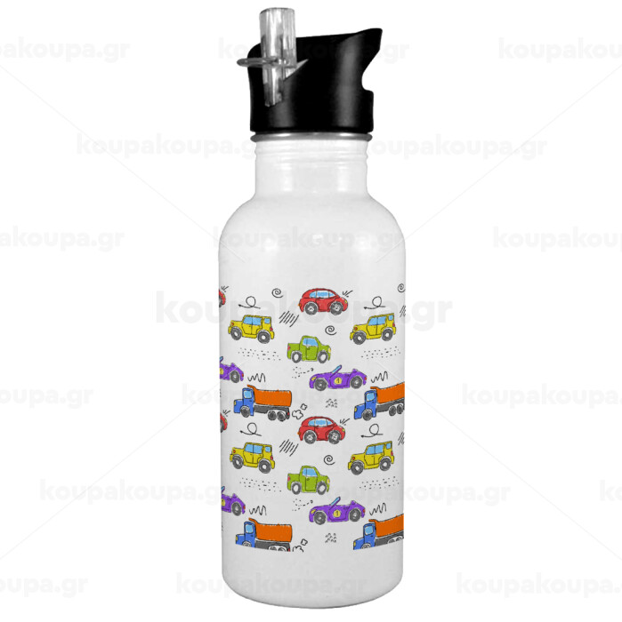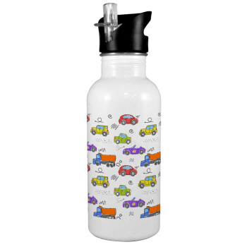 Αμαξάκια, Παγούρι νερού Λευκό με καλαμάκι, ανοξείδωτο ατσάλι 600ml