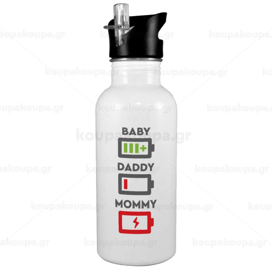 BABY, MOMMY, DADDY Low battery, Παγούρι νερού Λευκό με καλαμάκι, ανοξείδωτο ατσάλι 600ml