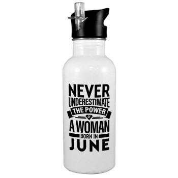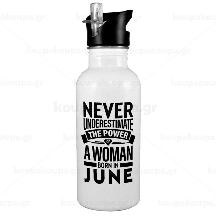 Never Underestimate the poer of a Woman born in..., Παγούρι νερού Λευκό με καλαμάκι, ανοξείδωτο ατσάλι 600ml