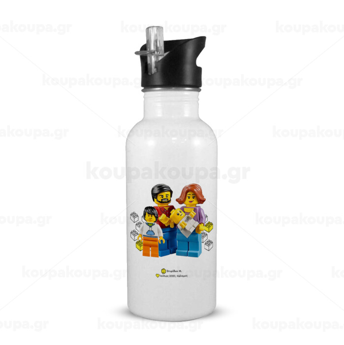 Τύπου Lego family, Παγούρι νερού Λευκό με καλαμάκι, ανοξείδωτο ατσάλι 600ml