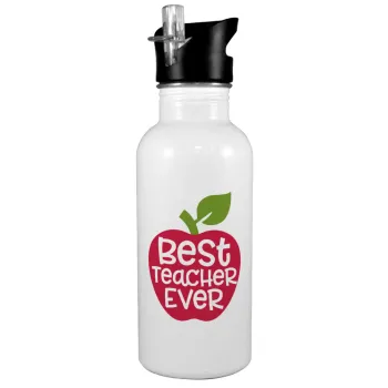 best teacher ever, apple!, Παγούρι νερού Λευκό με καλαμάκι, ανοξείδωτο ατσάλι 600ml