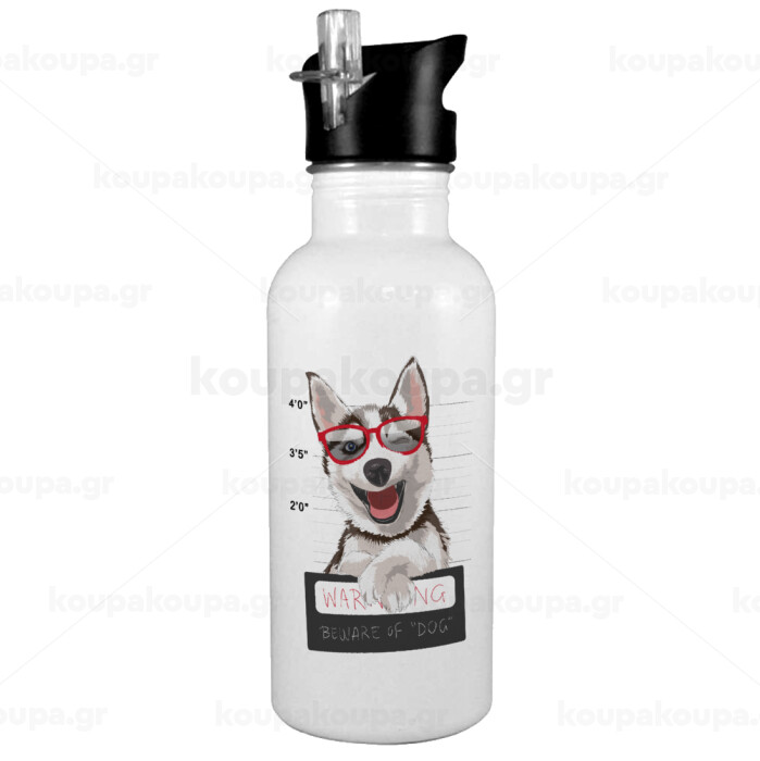Warning, beware of Dog, Παγούρι νερού Λευκό με καλαμάκι, ανοξείδωτο ατσάλι 600ml