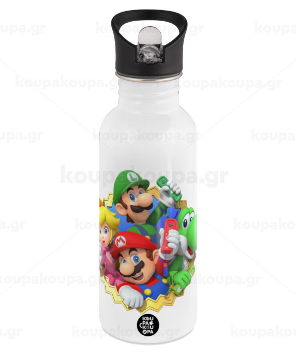 Super mario and Friends, Παγούρι νερού Λευκό με καλαμάκι, ανοξείδωτο ατσάλι 600ml