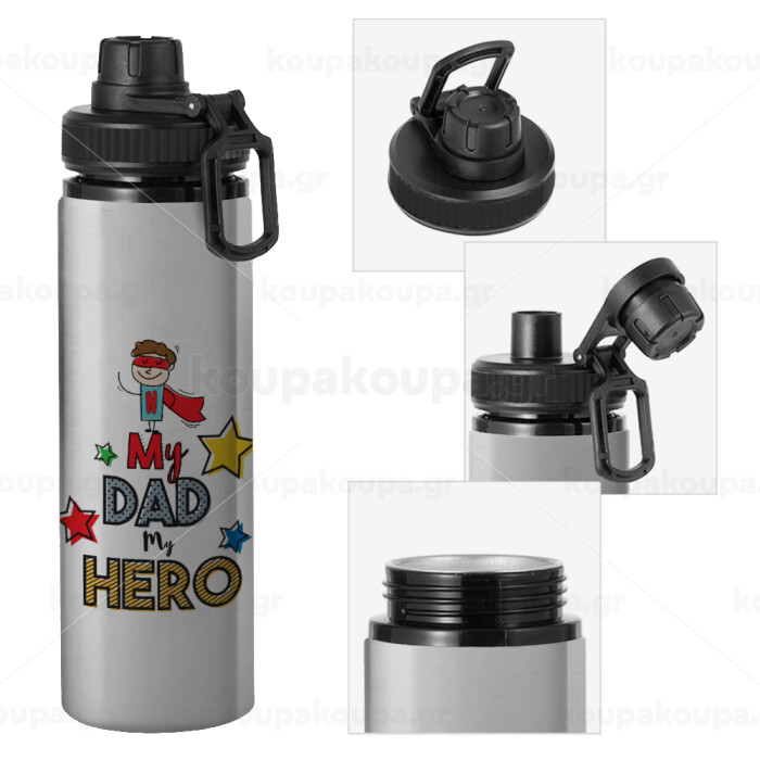 My Dad, my Hero!!!, Μεταλλικό παγούρι νερού με καπάκι ασφαλείας, αλουμινίου 850ml
