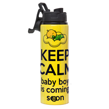 KEEP CALM baby boy is coming soon!!!, Μεταλλικό παγούρι νερού με καπάκι ασφαλείας, αλουμινίου 850ml
