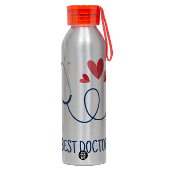 Best Doctor, Αλουμινένιο Αθλητικό Μπουκάλι 650ml – Ασημί με Κόκκινο Καπάκι και Λουράκι Σιλικόνης