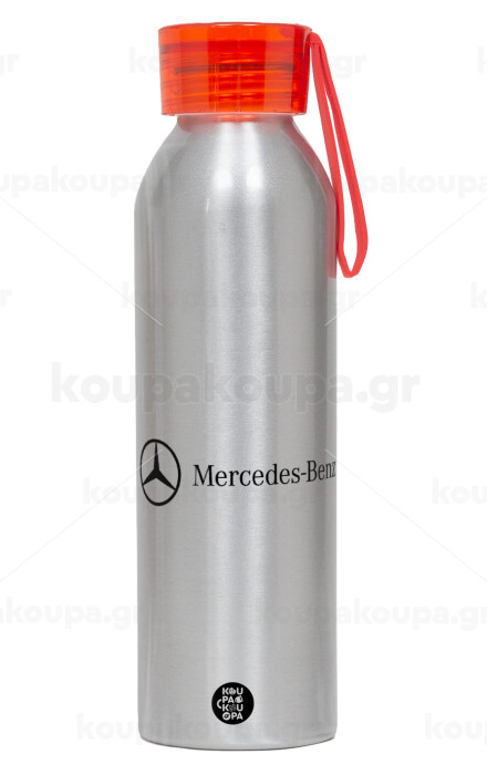 Mercedes small logo, Αλουμινένιο Αθλητικό Μπουκάλι 650ml – Ασημί με Κόκκινο Καπάκι και Λουράκι Σιλικόνης