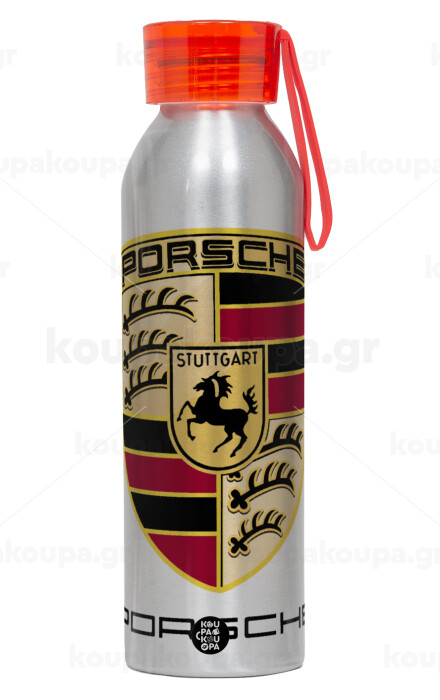Porsche, Αλουμινένιο Αθλητικό Μπουκάλι 650ml – Ασημί με Κόκκινο Καπάκι και Λουράκι Σιλικόνης