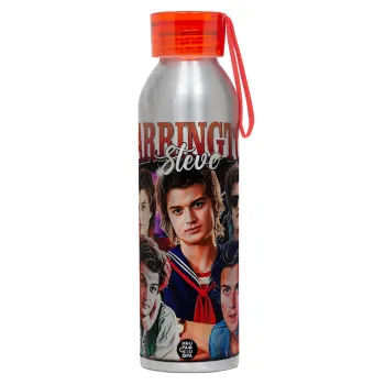 Steve Harrington, Stranger Things, Αλουμινένιο Αθλητικό Μπουκάλι 650ml – Ασημί με Κόκκινο Καπάκι και Λουράκι Σιλικόνης