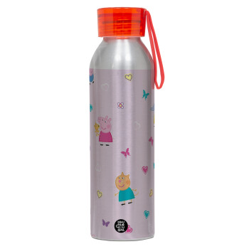 Πέππα το γουρουνάκι και οι φίλοι της, Αλουμινένιο Αθλητικό Μπουκάλι 650ml – Ασημί με Κόκκινο Καπάκι και Λουράκι Σιλικόνης