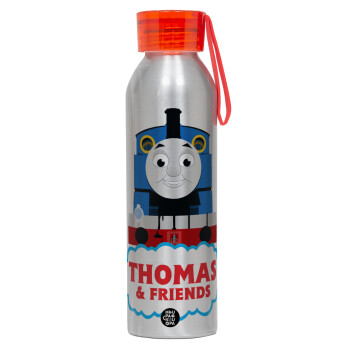 Τόμας το τρενάκι, Αλουμινένιο Αθλητικό Μπουκάλι 650ml – Ασημί με Κόκκινο Καπάκι και Λουράκι Σιλικόνης