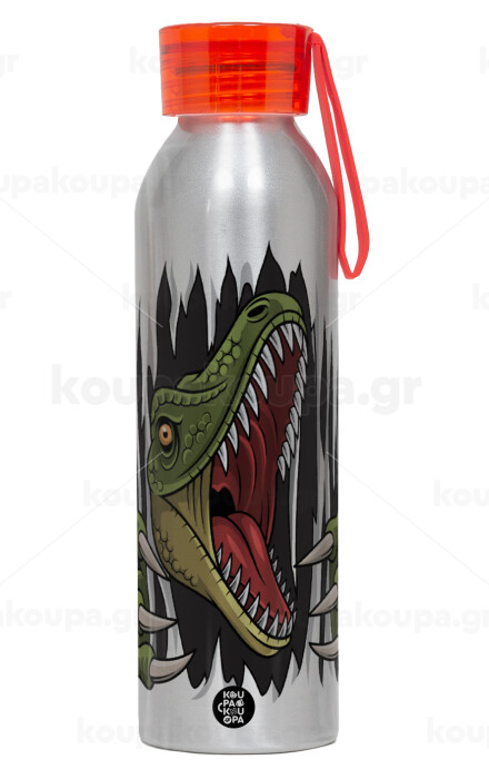 Dinosaur scratch, Αλουμινένιο Αθλητικό Μπουκάλι 650ml – Ασημί με Κόκκινο Καπάκι και Λουράκι Σιλικόνης
