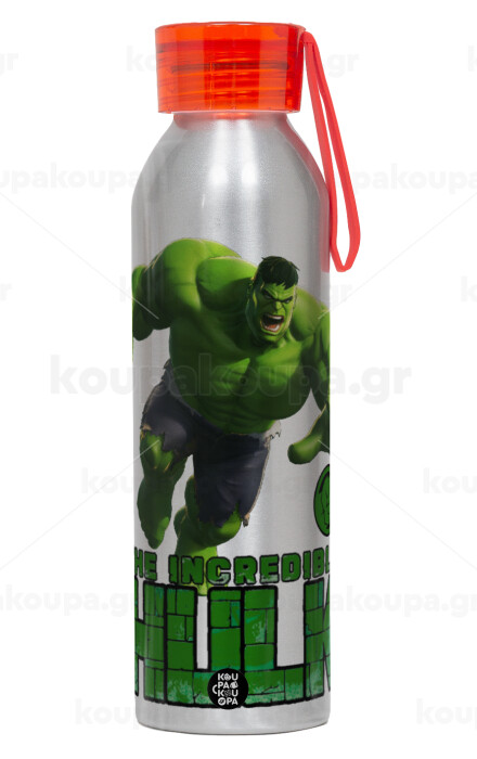 Hulk, Αλουμινένιο Αθλητικό Μπουκάλι 650ml – Ασημί με Κόκκινο Καπάκι και Λουράκι Σιλικόνης