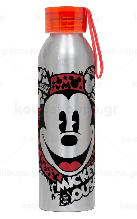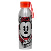 Mickey Mouse, Αλουμινένιο Αθλητικό Μπουκάλι 650ml – Ασημί με Κόκκινο Καπάκι και Λουράκι Σιλικόνης