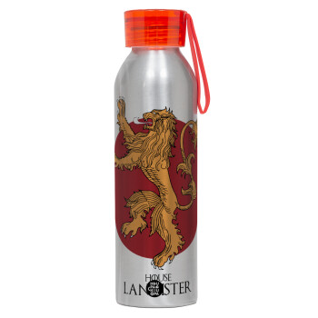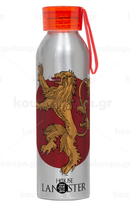 House Lannister GOT, Αλουμινένιο Αθλητικό Μπουκάλι 650ml – Ασημί με Κόκκινο Καπάκι και Λουράκι Σιλικόνης