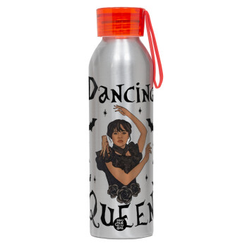 Wednesday Addams Dance, Αλουμινένιο Αθλητικό Μπουκάλι 650ml – Ασημί με Κόκκινο Καπάκι και Λουράκι Σιλικόνης