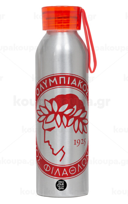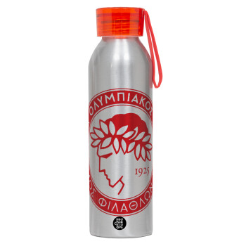 Ολυμπιακός, Αλουμινένιο Αθλητικό Μπουκάλι 650ml – Ασημί με Κόκκινο Καπάκι και Λουράκι Σιλικόνης