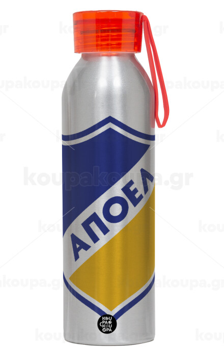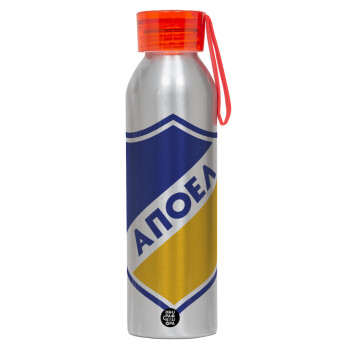 FC ΑΠΟΕΛ Λευκωσίας, Αλουμινένιο Αθλητικό Μπουκάλι 650ml – Ασημί με Κόκκινο Καπάκι και Λουράκι Σιλικόνης