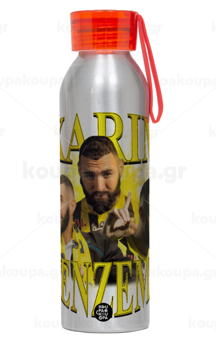 Karim Benzema, Αλουμινένιο Αθλητικό Μπουκάλι 650ml – Ασημί με Κόκκινο Καπάκι και Λουράκι Σιλικόνης