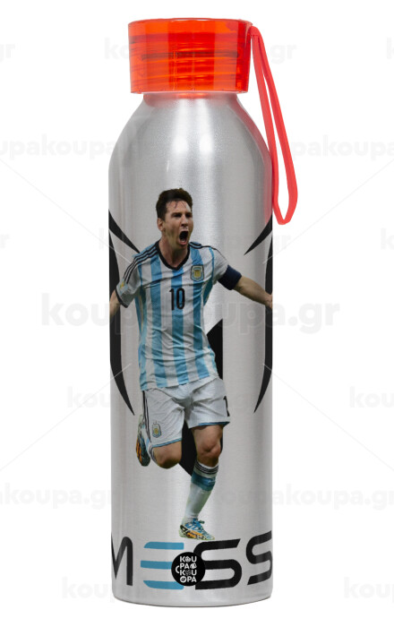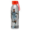 Λιονέλ Μέσι, Leo Messi, Αλουμινένιο Αθλητικό Μπουκάλι 650ml – Ασημί με Κόκκινο Καπάκι και Λουράκι Σιλικόνης