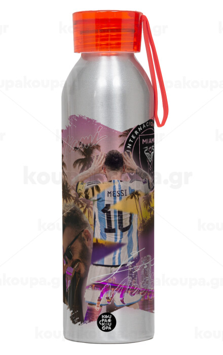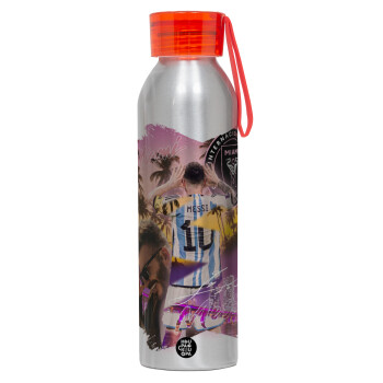 Lionel Messi Miami, Αλουμινένιο Αθλητικό Μπουκάλι 650ml – Ασημί με Κόκκινο Καπάκι και Λουράκι Σιλικόνης