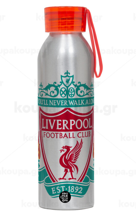 Liverpool, Αλουμινένιο Αθλητικό Μπουκάλι 650ml – Ασημί με Κόκκινο Καπάκι και Λουράκι Σιλικόνης