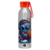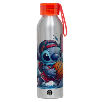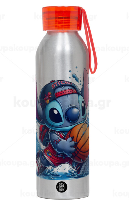 Stitch Basketball, Αλουμινένιο Αθλητικό Μπουκάλι 650ml – Ασημί με Κόκκινο Καπάκι και Λουράκι Σιλικόνης