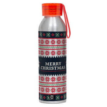 Merry Christmas Vintage, Αλουμινένιο Αθλητικό Μπουκάλι 650ml – Ασημί με Κόκκινο Καπάκι και Λουράκι Σιλικόνης