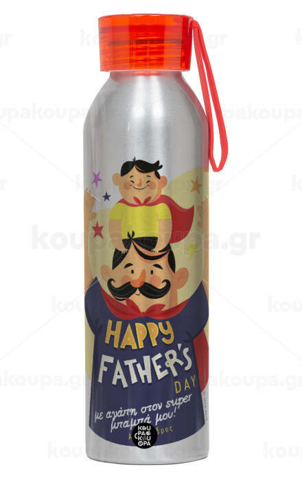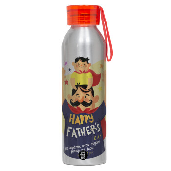 Happy Fathers Day με όνομα, Αλουμινένιο Αθλητικό Μπουκάλι 650ml – Ασημί με Κόκκινο Καπάκι και Λουράκι Σιλικόνης