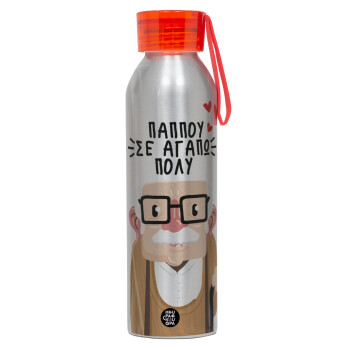 Παππού σε αγαπώ πολύ!, Αλουμινένιο Αθλητικό Μπουκάλι 650ml – Ασημί με Κόκκινο Καπάκι και Λουράκι Σιλικόνης